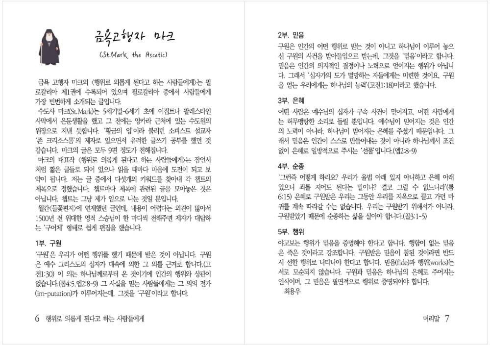 금욕 고행자 마크의금욕 고행자 마크의 <행위로 의롭게 된다고 하는 사람들에게>는 필로칼리아 제1권에 수록되어 있으며 필로칼리아 중에서 사람들에게 가장 빈번하게 소개되는 글입니다.